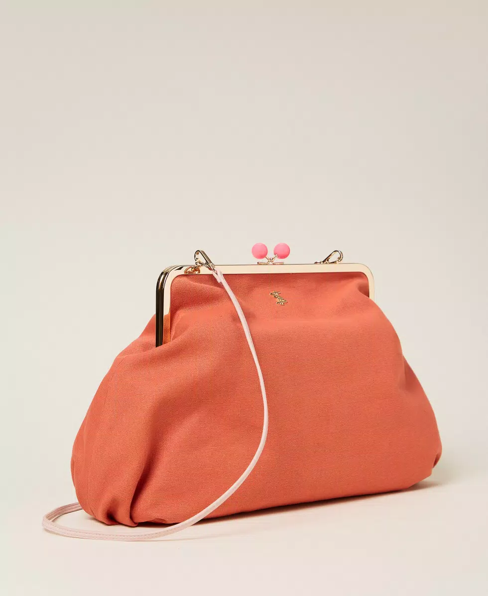 Maxi pochette morbida firmata dall’artista Myfo per la collezione Actitude in canvas tinto in pezza. Ha chiusura a scatto e sfere in resina colorata, catena rimovibile a spalla o cross-body, dettagli in metallo color oro, logo applicato davanti.