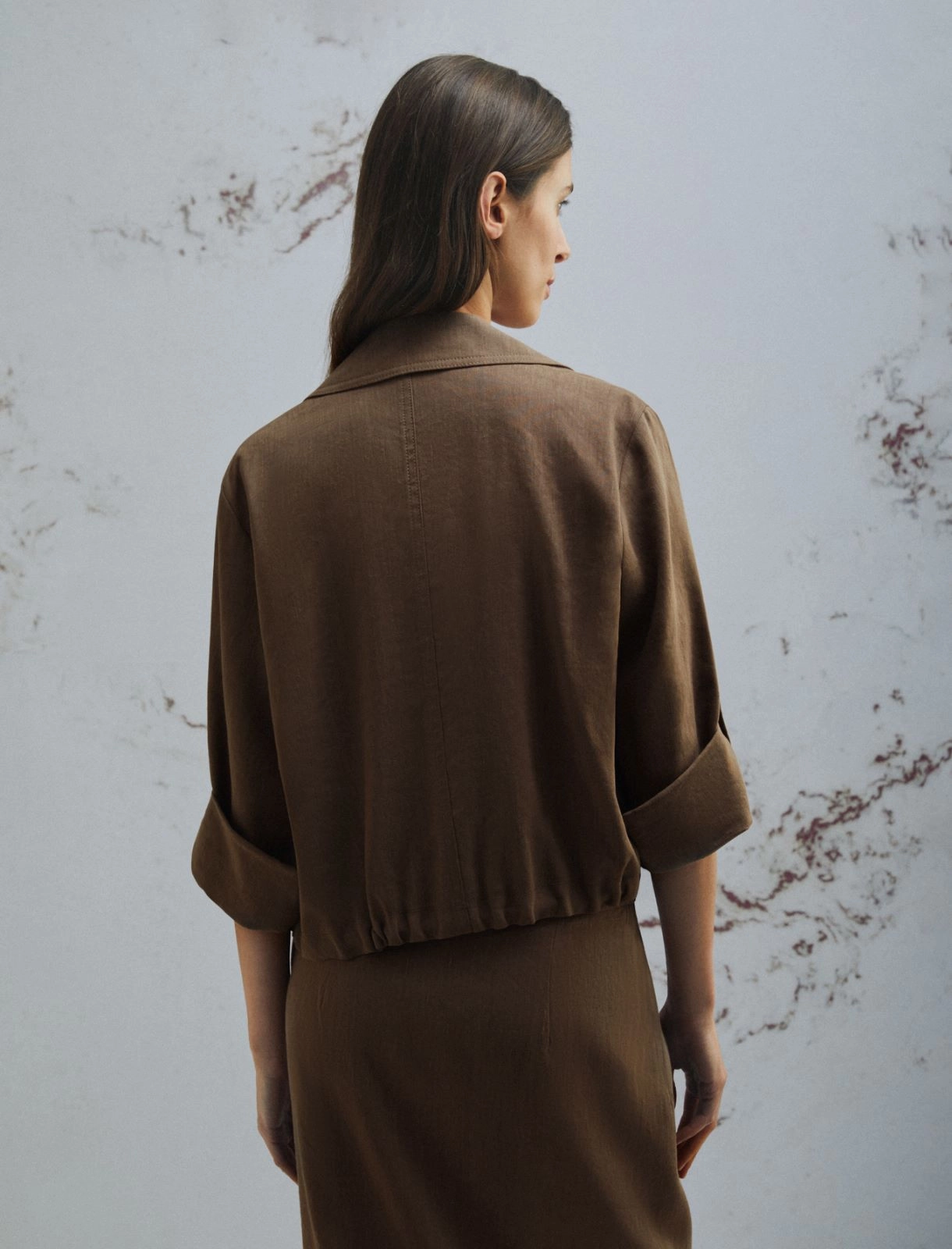 Fluida, corta e leggera, la giacca in viscosa e lino interpreta la nuova stagione con un twist contemporaneo. Piccole pieghe al fondo chiudono il volume, mentre le maniche arrotolate introducono un’allure casual.