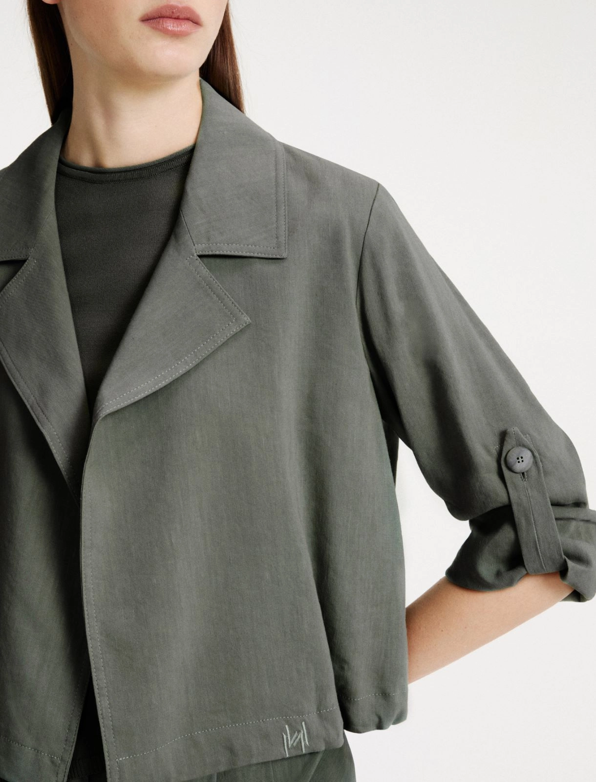 Fluida, corta e leggera, la giacca in viscosa e lino interpreta la nuova stagione con un twist contemporaneo. Piccole pieghe al fondo chiudono il volume, mentre le maniche arrotolate introducono un’allure casual.